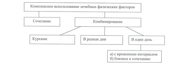Комбинирование представляет последовательное использование лечебных физических факторов. При этом комбинируемые физические факторы могут применяться в один день, в разные дни или курсовое воздействие одним фактором сменяется другим курсом.