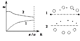 Колебания, отраженные кривой 1, называют акустическими, отраженные кривой 2 – оптическими. Случай акустических и оптических колебаний одномерной цепочки проиллюстрирован на рис. 1.5, б. Очевидно, что для цепочки атомов во втором случае (оптические колебания) тяжелые и легкие атомы колеблются в противофазе, что приводит к более высокой частоте колебаний легких атомов. Существует другая модель для описания тепловых колебаний кристаллической решетки. Она заключается в том, что энергию колебаний представляют в виде энергии квантовых гармонических осцилляторов (п. 2.7)