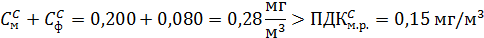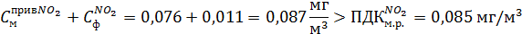 эффектом суммации действия обладают диоксид азота (вещество II класса опасности) и диоксид серы (вещество III класса опасности). Определяем приведенную к диоксиду азота концентрацию этих веществ, так как диоксид азота относится к наибольшему (второму) классу опасности (формула 6.10):