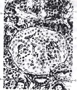 | Рис. 1.59. Срез поджелудочной железы человека: 1 – внешнесекреторные концевые отделы; 2 – внутрисекреторные концевые отделы; 3 – междольковая соединительнотканная перегородка; 4 – междольковый выводной проток; 5 – секрет в протоке железы. | Рис. 1.60. Клеточный состав поджелудочных островков: 1 – α-клетки; 2 – β-клетки; 3 – σ-клетки; 4 – РР-клетки. |