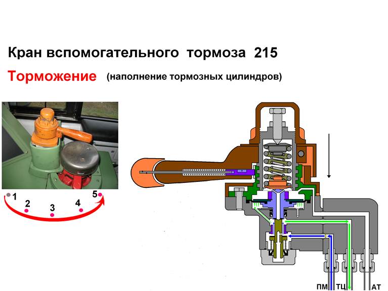 Торможение. Для торможения локомотива, ручку крана № 254 перемещают в одно из тормозных положений. При этом стакан ввинчивается в крышку и сжимает пружину. Диафрагма опускается, и отжимает впускной клапан от своего седла. Тогда воздух из питательной магистрали поступает к тормозным цилиндрам, а также по каналу в полость под диафрагмой.