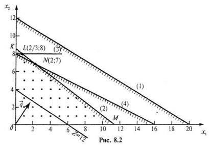 На рис. 8.2 OKLM — область допустимых решений задачи (8.Г)- (8.3'), ограниченная прямыми (1), (2), (3) и осями координат; £(2/3; 8) — точка оптимального, но нецелочисленного решения задачи (8.Г) - (8.3'); (4) — прямая, отсекающая это нецелочисленное решение; OKNM — область допустимых решений расширенной задачи (8.1') - (8.3'), (8.6'); М2; 7) — точка оптимального целочисленного решения.