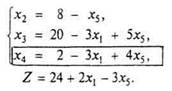 Базисное решение Х4 = (-; 8; 18; 0; 0; --) — недопустимое. (Заметим, что после включения в систему ограничений дополнительного уравнения, соответствующего правильному отсечению, всегда будет получаться недопустимое базисное решение):