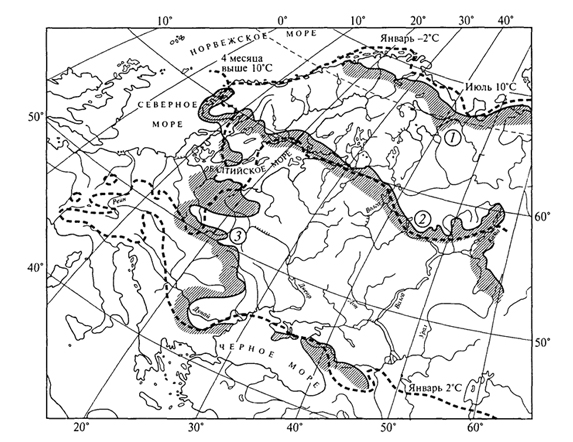 Рис. 38. Границы ареалов ели (1), дуба (2) и бука (3) в сопоставлении со среднемесячными изотермами января и июля (Г.Вальтер, 1982)