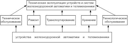 Техническая эксплуатация устройств и систем железнодорожной автоматики и телемеханики — это полный комплекс работ, необходимых для обеспечения высокого качества их функционирования от пуска в эксплуатацию до реконструкции, включающий в себя технологическое и техническое обслуживание, ремонт, транспортирование и хранение, выполняемых с использованием соответствующих технических средств (рис. 1.1).