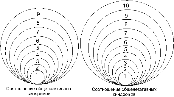 Для негативных синдромов: 1 – истощаемость психической деятельности, 2 – субъективно осознаваемая измененность, 3 – объективные изменения личности, 4 – дисгармония личности, 5 – снижение энергетического потенциала, 6 – снижение уровня личности, 7 – регресс личности, 8 – амнестические расстройства, 9 – слабоумие, 10 – психический маразм.