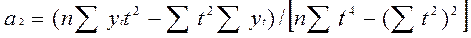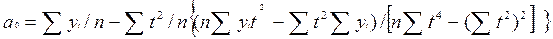 Аналогично определяются коэффициенты полинома второй степени (параболы), которые после переноса начала координат в середину ряда динамики имеют вид