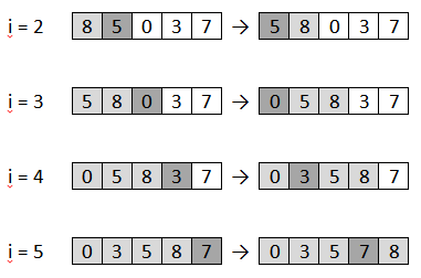 Рассмотрим на примере числовой последовательности процесс сортировки методом вставок (рис. 6.3). Клетка, выделенная темно-серым цветом – активный на данном шаге элемент, ему также соответствует i-ый номер. Светло-серые клетки это те элементы, значения которых сравниваются с i-ым элементом. Все, что закрашено белым – не затрагиваемая на шаге часть последовательности.