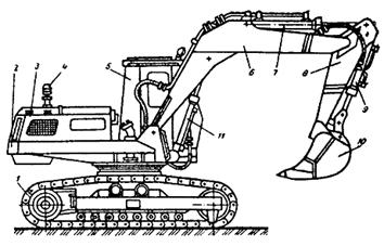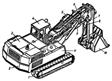 1 - ходовая тележка; 2 - поворотная платформа; 3 - силовая установка; 4 - труба выхлопных газов; 5 - кабина; 6 - стрела; 7, 9, 11 - гидроцилиндры рукояти, ковша и стрелы; 8 - рукоять; 10 - ковш.