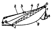 1 - наводка; 2 - канат; 3 - блок; 4 - канат; 5 - стрела; 6 - блок; 7 - канат; 8 - ковш драглайна; 9 - канат.