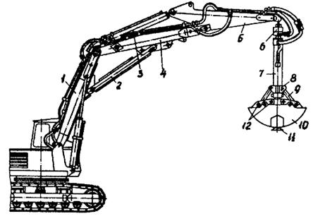 1 - базовая часть стрелы; 2 - тяга; 3 - гидроцилиндр рукояти; 4 - головная часть стрелы; 5 - рукоять; 6 - поворотная головка; 7 - рама; 8 - ползун; 9 - тяги; 10 - челюсть ковша; 11 - зубья ковша; 12 - оси.