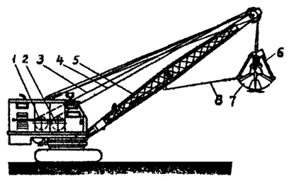 1, 2 - барабаны; 3 - тяговый канат; 4 - подъемный канат; 5 - стрела; 6 - тяги челюстей ковша; 7 - грейфер; 8 - оттяжка.