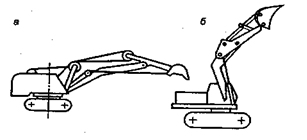 По типу подвески рабочего оборудования (рис. 8) различают экскаваторы с гибкими элементами (преимущественно канатами) для удержания и приведения в действие рабочего оборудования (гибкая подвеска) и с жесткими элементами - преимущественно гидравлическими цилиндрами (жесткая подвеска).