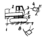 1 - противовес; 2 - силовая установка; 3 - кабина; 4, 7 - труба выхлопных газов; 5 - поворотная платформа; 6 - опорно-поворотное устройство; 8 - ходовое устройство