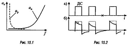 Межсимвольные искажения возникают и за счет ограничения полосы пропускания линейного тракта в области низких частот. Частотная характеристика затухания ар приведена на рис. 8.1 в линейном тракте, которые ограничивают полосу частот цифрового сигнала снизу за счет подавления постоянной и низкочастотных составляющих спектра. Искажения, которым подвергаются исходные импульсы двоичного сигнала (рис. 8.2, а) в этом случае, показаны на рис. 8.2, б. Из рисунка видно, что после передачи символа единицы появляется напряжение другого знака, и, таким образом, каждый следующий единичный символ уменьшается по амплитуде. В связи с этим на приемной стороне встает проблема восстановления постоянной составляющей цифрового сигнала, поскольку в противном случае возникают большие ошибки при приеме единиц. Сложность восстановления постоянной составляющей усугубляется также и тем, что среднее значение энергии однополярной случайной импульсной последовательности изменяется во времени, так как меняется число импульсов единиц, поступивших на вход приемного устройства за определенный отрезок времени.