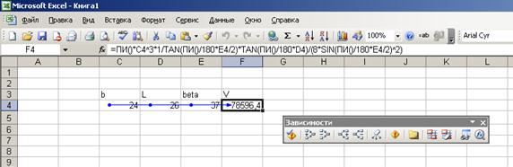 Можно отобразить какие ячейки влияют на формулу в выбранной ячейке или какие ячейки зависят от выбранной. Для отображения надо вызвать панель зависимостей: (Пункты меню «Сервис»à «Зависимости формул»à «Панель зависимостей» и на панели «Зависимости» нажать кнопку «Влияющие ячейки».