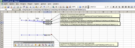 При оформлении отчёта по работе необходимо показать формулы, содержащиеся в ячейках. Для этого надо каждой ячейки с формулой добавить примечание, щёлкнув правой кнопкой в соответствующей ячейке, в появившемся контекстном меню выбрать пункт «Добавить примечание», затем «Отобразить или скрыть примечание», написать в окне примечания пояснения и формулу (формулу можно скопировать из строки формул).