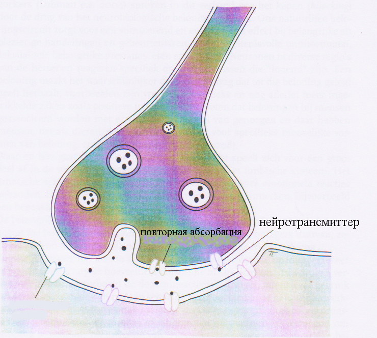 | Егер біз миінда ауытқуларды көрсек, онда ол есірткілерді қабылдауының нәтижесі әлде зиян келтіре қабылдауға келтірген туа пайда болған ауытқулар болып табылады ма деп табу керекпіз? Жүрек қағысын жиілігін жоғарлататын кокаин және ауру сезімін басатын седативті әсер ететін героин неге ми жүйесіне бірдей әсер етеді? Себебі түсінікті: барлық есірткілердің қабылдауы жатқан ядроға дофаминің (оның іс-әрекетің еліктеметін сигналдарды да) күшейтілген құйылуын білдіреді. Дофаминтәуелділіктіңбарлық түрлерінде рөл атқарады. Ол заттек кейбір есірткінің қоздыратын немесе тыныштандыратын немесе галлюциогенді әсерімен байланысты емес. Егер қоздырғыштар байқалса, онда дофаминің деңгейі жоғарлайды, сол кезде ол есіркіні қабылдауына келтіру мүмкін. | Ескертеміз, жүйке жүйесі нейрондардан тұрады, олар жасушалы денелерден, дендриттерден (өскіндіктерден) тұрады, олар нейронға басқа нейрондардан сигналдарды алуға және аксонға басқа жасуша-алушыларға сигналдарды тарауға көмектеседі. нейроның ішінде тітіркенуі ол электрондық импульс болып табылады жүйке жасушылардын арасында электрондық импульстарды таралуы ол химикалық үрдіс болып табылады, оның ішінде маңызды рөлді нейротрансмиттерлер атқарады (1 сүрет). |