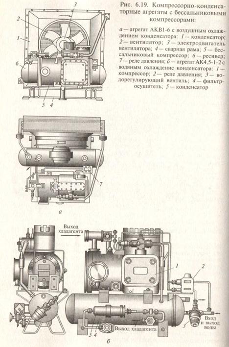 Компрессорно-конденсаторный агрегат с воздушным охлаждением конденсатора (рис. 6.19, а) состоит из поршневого бессальникового компрессора 5, конденсатора 7 с вентилятором 2, смонтированных на сварной раме 4. На ней установлен также и ресивер 6. Агрегат оснащен реле давления, запорной и соединительной арматурой. Работа электродвигателя вентилятора и работа электродвигателя компрессора между собой не связаны. При остановке электродвигателя компрессора электродвигатель вентилятора продолжает работать.