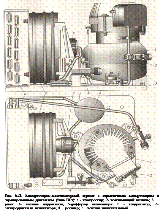 В состав агрегата (рис. 6.20) входит герметичный компрессор 4, ребристотрубный конденсатор / с воздушным охлаждением, вентилятор с электродвигателем 6 и диффузором 2. Все элементы агрегата монтируются на стальной штампованной раме 7 и соединяются трубопроводами. Предусмотрены запорные вентили на линии всасывания в компрессор и на выходе из ресивера.