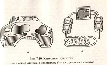 Камерные глушители выполняют либо литыми — в общей отливке с цилиндром, либо выносными — из отдельных штампованных элементов. Следует отметить, что в камерные глушители пар из кожуха герметичного компрессора обычно входит по двум или более всасывающим трубкам, зачастую имеющим различные длину и (или) диаметр (рис. 7.10).