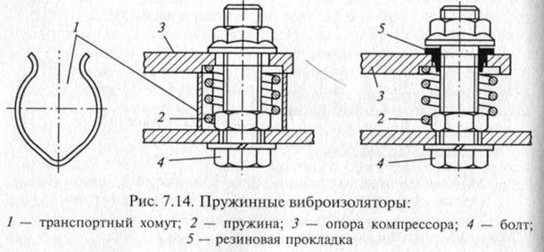 при работе, пусках и остановках, а также при транспортировании агрегатов. Применяют внутренние пружинные, наружные пружинные и резиновые, а также комбинированные виброизоляторы.
