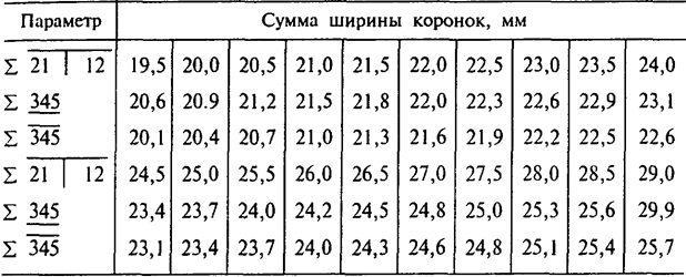 ных клыков и премоляров. Результат сравнивают со среднестатистическими показателями нормы (табл. 4.2) с учетом 2 а, после чего судят о недостатке или избытке места для зубов.