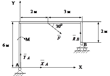 , пара сил с моментом М и равномерно распределенная нагрузка интенсивности q. Освободим угольник от связей и заменим их действие реакциями связей xA, yA, MA,