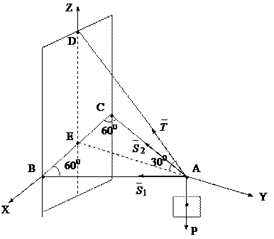 2.Найти усилия в стержнях АВ и АС и усилие в тросе AD, если дано, что ÐCBA=ÐBCA=600, ÐEAD=300. Вес груза Р равен 300 Н. Плоскость АВС горизонтальна. Крепления стержней а точках А, В и С шарнирные (рис.5.13).