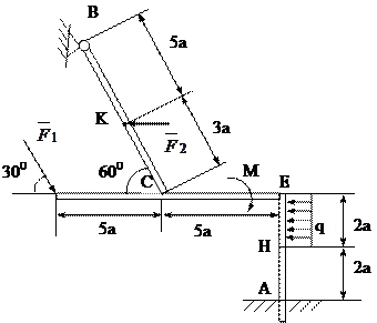 4. Конструкция (рис.5.15) состоит из жесткого угольника и стержня, которые в точке С свободно опираются друг на друга. В точке А конструкция жестко заделана в стену, а в точке В имеет шарнирное крепление. На конструкцию действуют: пара сил с моментом М=60 кН×м, сила F1=10 кН, направленная под углом a=300 к горизонтальной оси и приложенная в точке L, а также горизонтальная сила F2=20 кН, приложенная в точке К. Кроме того на участке ЕН действует равномерно распределенная нагрузка интенсивности q=20 кН/м. Определить реакции связей в точках А,В,С, вызванные этими нагрузками. При окончательных расчетах принять а=0,2 м.