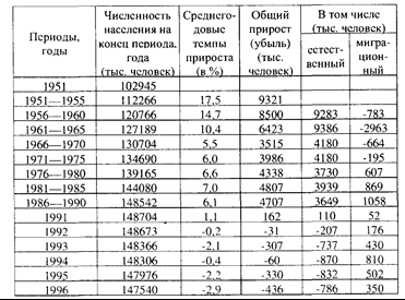 Компоненты изменения численности населения России с 1951 по 1996 гг.*
