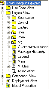 Пакеты предназначены для группировки элементов в группы по определенным критериям. В простейшем случае классы можно группировать по их стереотипам. Создадим три пакета: Entities (классы-сущности), Boundaries (граничные классы) и Control (управляющие классы). Для этого необходимо щелкнуть правой кнопкой мыши на Логическом представлении браузера (Logical View), в появившемся контекстном меню выбрать пункт New > Package (Создать > Пакет), и ввести имя пакета. Результат создания пакетов показан на рис.4: