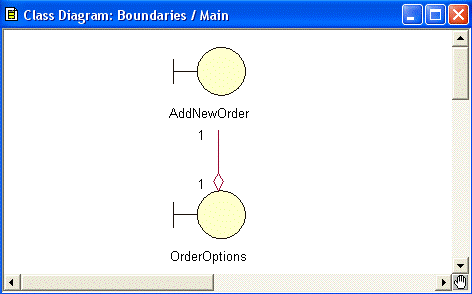 Добавим теперь на диаграмму граничные и управляющие классы (рис. 3). Рассматриваемый сценарий - это только одно из действий, которые обеспечивает прецедент "Работа с заказом". Прецедент также позволяет просмотреть, отредактировать или удалить заказ. Это означает, что необходимо предусмотреть механизм, который позволяет выбирать необходимое действие. Создадим для этого граничный класс OrderOptions (Параметры работы с заказом) с комментарием "Класс, обеспечивающий механизм работы с заказами". Также создадим граничный класс AddNewOrder (Добавление нового заказа), который будет служить для добавления новых заказов (комментарий - "Класс служит для добавления новых заказов". Отношение между этими классами - агрегация, поскольку в данном случае класс AddNewOrder рассматривается как часть класса OrderOptions, частями которого также будут классы для просмотра, редактирования и удаления заказов. Кратность связи 1 к 1, поскольку в состав класса OrderOptions входит только один класс AddNewOrder.