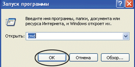 б. В диалоговом окне Run (Выполнить)ведите команду cmd, а затем нажмите кнопку «ОК».