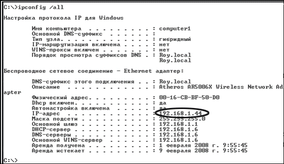 г. В выходных данных команды ipconfig /allотображается информация об IP-конфигурации компьютера. Пример выходных данных показан на следующем рисунке. Информация, отображаемая для конкретного компьютера, может быть другой.