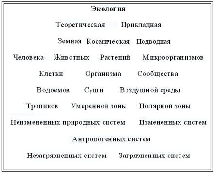 Объем науки «экология» может быть хорошо охарактеризован рисунком 1.4. На рисунке возможные направления дисциплины выбираются различными сочетаниями приведенных объектов и факторов.