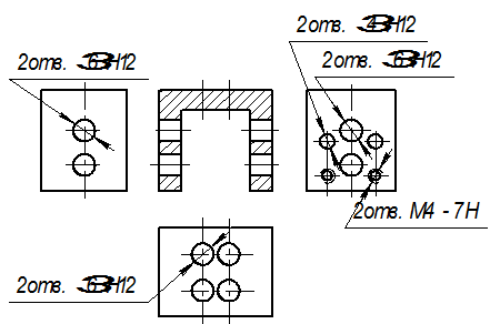 8. Если одинаковые элементы изделия (например, отверстия) расположены на разных поверхностях и показаны на разных изображениях, то количество этих элементов записывают отдельно для каждой поверхности (рис. 4.26).