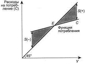 Графическая интерпретация функции сбережения представляет собой зеркальное отражение функции потребления. Построенная в координатах «сбережения – доход», она наглядно, демонстрирует описанные выше ситуации в потребительском поведении. (нулевое (т. Е), отрицательное (слева от т.Е) и положительное (справа от т.Е) сбережения)