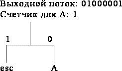 В результате проведенного кодирования выходной поток составил 44 бит вместо 56, что соответствует сжатию в 1,27 раза. При кодировании более длинных последовательностей это значение будет увеличиваться, т.к. дерево Хаффмана будет содержать все больше и больше символов, которые будут представлены в выходном потоке как коды переменной длины, а не парами esc и ASCII символов.