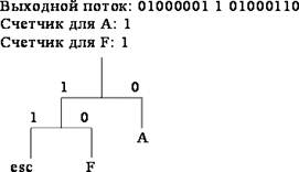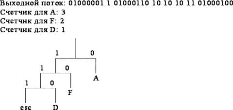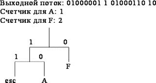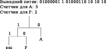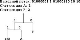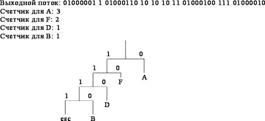Следующий символ D является новым, поэтому он должен быть записан в выходной поток как ASCII-символ, перед которым следует поставить esc-символ (рис. 1, е). Здесь в дереве Хаффмана появляется третий уровень, т.к. сумма счетчиков для esc-символа и D равна 1 (счетчик esc всегда 0) и это меньше суммы значений счетчиков F и А. Наконец, последний символ B записывается в незакодированном виде в выходной поток и добавляется в дерево Хаффмана (рис. 1, ж).