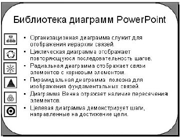 В составе MS PowerPoint 2003 имеется библиотека диаграмм, которая включает диаграммы различных типов, не основанные на числовых значениях (рис.9.1), например, организационную, радиальную и пирамидальную диаграммы или диаграмму Венна. Эти диаграммы делают подачу материала более наглядной и позволяют отображать: