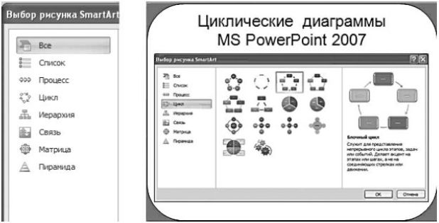 В программах Microsoft Office выпуска 2007 можно создавать подобные диаграммы, вставляя рисунки SmartArt . Для этого используется пиктограмма SmartArt в группе Иллюстрации вкладки Вставка. Для создания организационных диаграмм необходимо включить надстройку Organization Chart. На рис.9.2 отображены перечень типов рисунков SmartArt и возможные макеты циклических диаграмм.