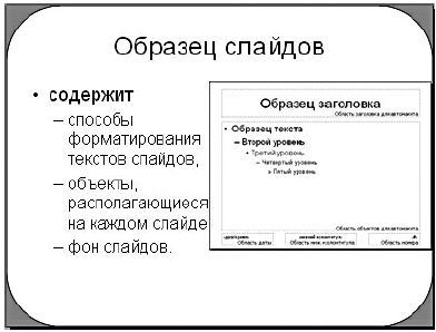 Если требуется модификация оформления всех слайдов презентации, то используют образец слайдов. При внесении изменения в образец модифицируется презентация в целом, т.е. презентация получает определенный фон для всех слайдов, искусно подобранные объекты, размещенные на каждом слайде, определенным образом оформленные списки, цветовую гамму и т.д. Все сделанные в образце слайдов изменения автоматически отразятся на каждом слайде, связанном с модифицированным образцом.