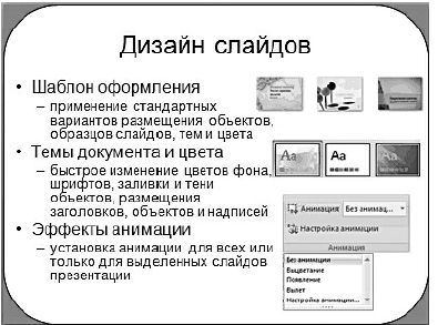 Каждая презентация представляет собой совокупность слайдов, на которых располагаются тексты, рисунки, диаграммы, кнопки и прочие элементы, которые не только являются информационным материалом, но и могут обладать различными свойствами, например, их появление может сопровождаться звуком или анимацией, или же выделение элементов может вызывать появление других элементов или смену слайдов.