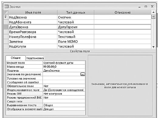 Поля таблицы и таблица в целом являются объектами базы данных и обладают целым рядом свойств, которые облегчают ввод и контроль данных. Значения свойств поля определяют отображение поля и допустимые действия с ним. Значения свойств таблицы определяют ее поведение. Для поля задаются тип поля, его размер, маска ввода, значения по умолчанию, ограничения на значения, сообщение в случае ошибки (рис.8.4). Для таблиц, например, определяются порядок сортировки и условия фильтрации, т.е. может задаваться вывод записей в алфавитном порядке значений некоторого текстового поля или вывод записей в порядке убывания дат. Свойства таблицы видны в окне свойств, доступном в режиме конструктора таблицы.