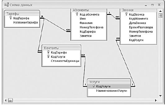 После проектирования таблиц и их полей следует определить первичный ключ каждой таблицы и провести анализ предполагаемых таблиц на соответствие нормальным формам (хотя бы первым трем). Например, в базу данных задачи об оплате звонков после нормализации добавлены еще две таблицы – таблица с перечнем услуг (таблица Услуги) и таблица со стоимостью каждой услуги в рамках существующих тарифов (таблица Контакты). Это позволяет избежать дублирования информации о тарифах и услугах. Структуры таблиц показаны на схеме базы данных (рис.8.5). Первичные ключи таблиц помечены слева изображением ключа. Заметим, что поля Код абонента, Код звонка, Код тарифа и Код услуги являются полями, обеспечивающими уникальную идентификацию записей в соответствующих таблицах. В таблице Контакты определен составной ключ, который образуется комбинацией полей Код тарифа и Код услуги.