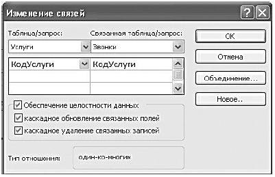 В случае необходимости обеспечения целостности данных в MS Access предусмотрено задание дополнительных свойств для устанавливаемой связи (рис.8.6), а именно каскадное обновление значений связанных полей и каскадное удаление связанных записей. Каскадное обновление предусматривает обновление внешнего ключа во всех записях подчиненных таблиц при изменении значения поля связи в главной таблице. Т. е. если изменился бы код услуги в таблице Услуги, то автоматически код услуги заменился бы на новый в связанных записях таблиц Звонки и Контакты. Каскадное удаление приводит к удалению всех записей подчиненных таблиц, связанных с удаляемой записью главной таблицы. Если бы удалялась запись таблицы Услуги, то автоматически удалились бы связанные записи таблиц Звонки и Контакты.