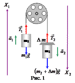 Рассмотрим систему, изображенную на рис. 1, состоящую из двух цилиндров массой m1, m2 и перегрузка Dm, добавленного к правому цилиндру. Предположим, что цилиндры связаны нерастяжимой нитью, перекинутой через невесомый блок, трение отсутствует. Запишем уравнение движения (второй закон Ньютона) для левого и правого грузов: