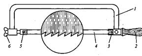 1 – станок; 2 – рукоятка; 3 – штифты; 4 – ножовочное полотно; 5 – головка крепления ножовочного полотна; 6 – натяжной винт с гайкой