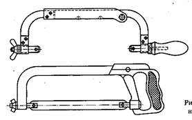 Ручные слесарные ножовки предназначены в основном для разрезания сортового и профильного проката вручную, а также для разрезания толстых листов и полос, прорезания пазов и шлицев в головках винтов, обрезания заготовок по контуру и других работ, разрезание выполняется при помощи ножовочных полотен, которые изготавливают из углеродистой (марки Р9 или Р18) или легированной (марки Х6ВФ) инструментальной стали и после нарезания зубьев закаливают. Наиболее распространены ножовочные полотна шириной 13 и 16 мм при толщине от 0,5 до 0,8 мм и длиной 250...300 мм. Для осуществления резания полотно устанавливают в специальном ножовочном станке. Ножовочные станки бывают двух типов: цельные и раздвижные, позволяющие устанавливать в станок ножовочное полотно разной длины.